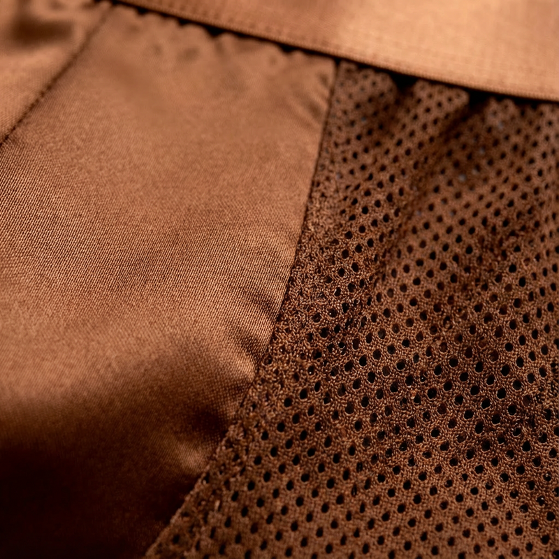 Es nuestro híbrido exclusivo. Hemos combinado un tejido de tacto seda (para una suavidad extrema y cero roces) con paneles laterales de malla técnica (para la ventilación). El resultado es la comodidad del lujo con la resistencia del deporte.